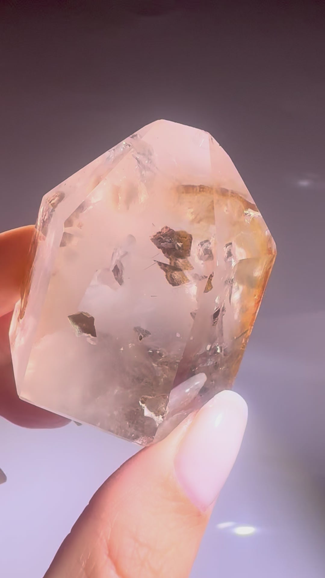 Entdecke meinen einzigartigen Lodalit-Kristall, ein klarer Bergkristall (Quarz) mit faszinierenden Einschlüssen aus Hämatit und Chlorid. Jede Kristallspitze ist ein kleines Naturkunstwerk – die Einschlüsse wirken wie mystische Landschaften in Miniatur, die das Licht auf zauberhafte Weise brechen.