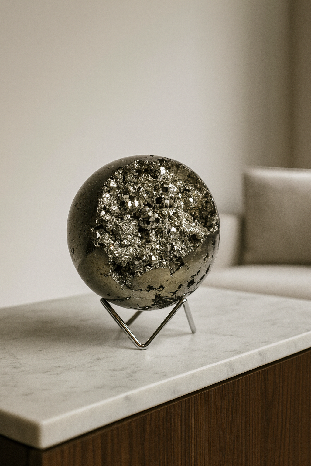 Diese Pyrit-Kugel ist nicht nur ein Schmuckstück, sondern auch ein kraftvoller Begleiter für Klarheit, Stärke und Wohlstand.