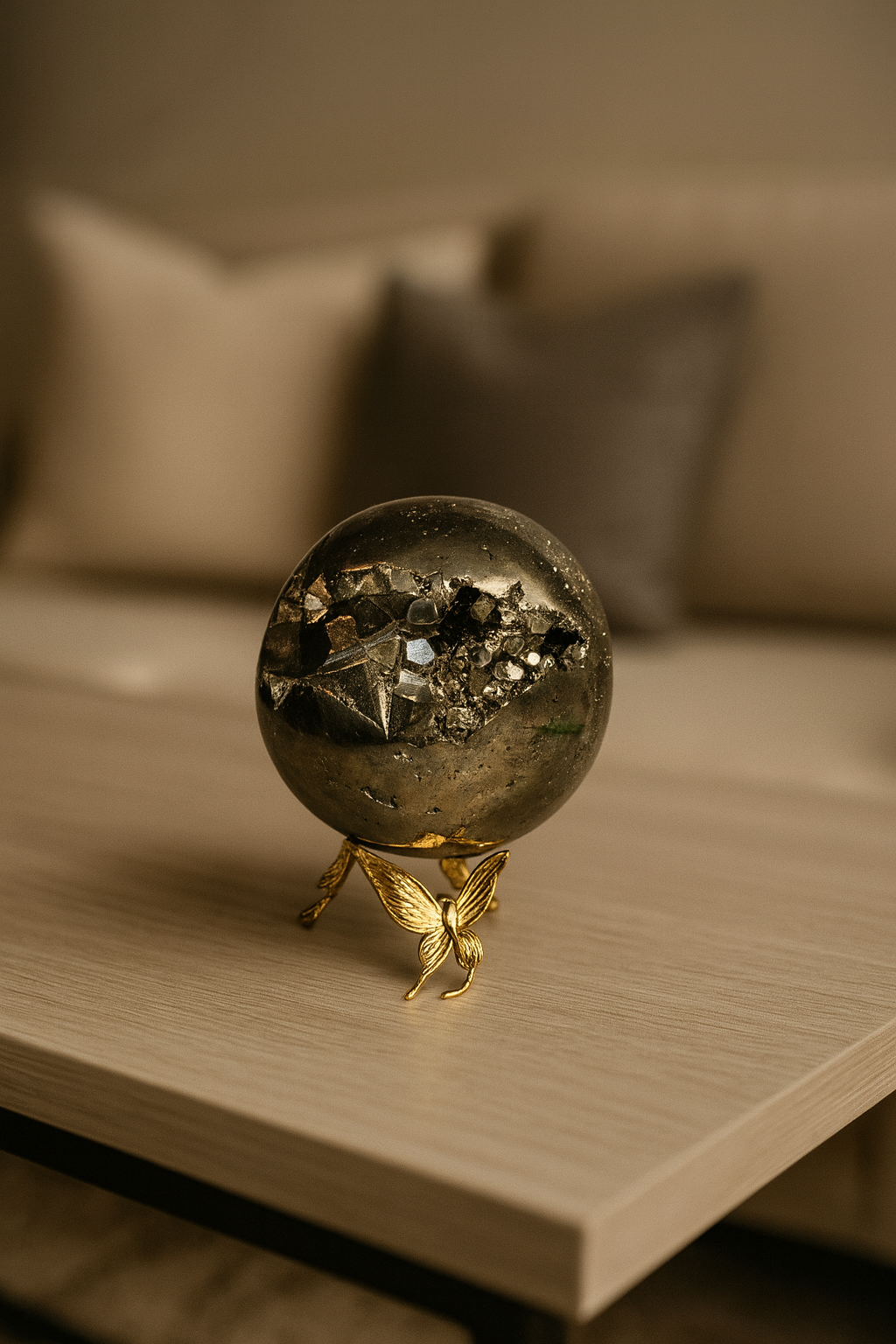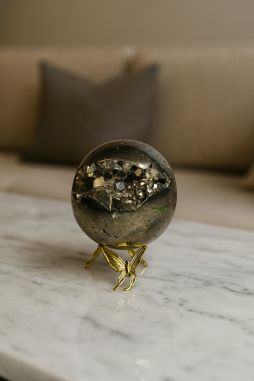 Die einzigartige goldene Farbe und die natürlich auftretenden Kristallstrukturen machen jede Kugel zu einem Unikat, das die Schönheit und Vielfalt der Natur widerspiegelt.