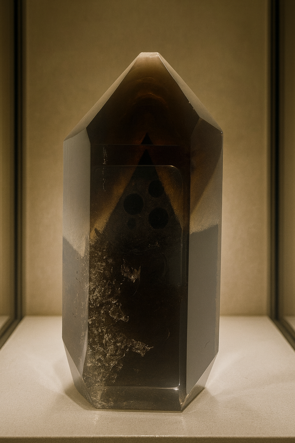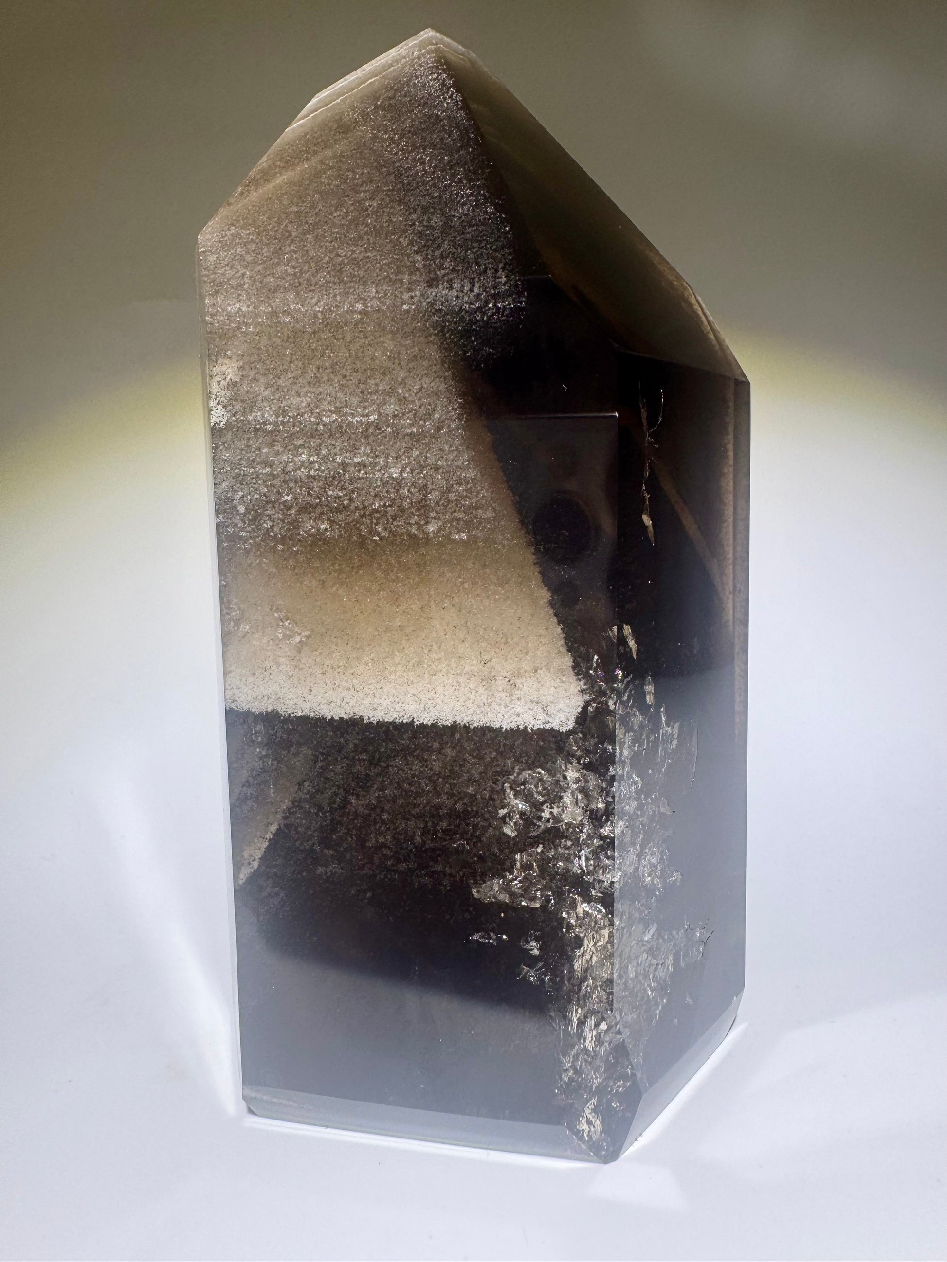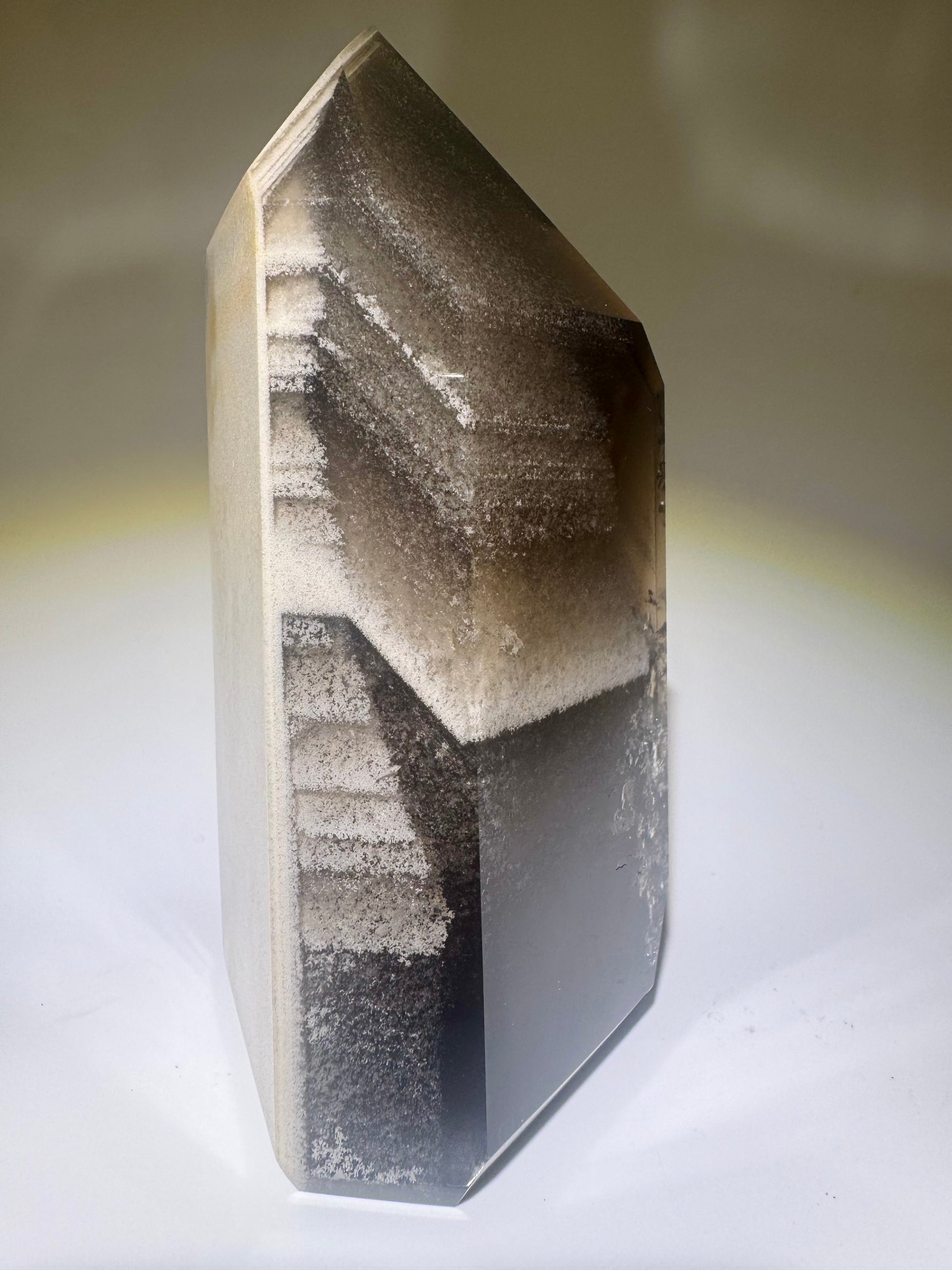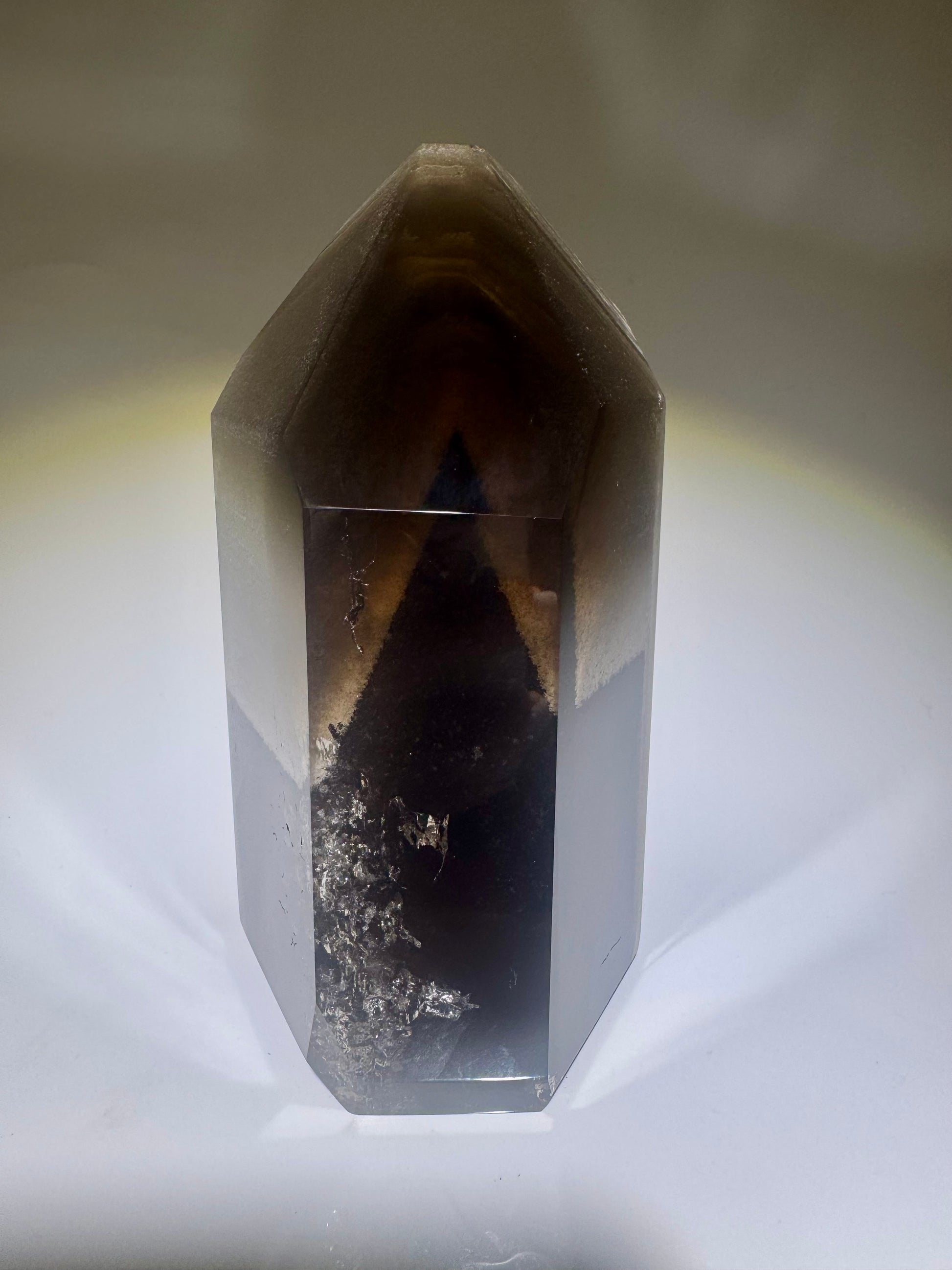 Dieser aussergewöhnliche Rauchquarz aus Brasilien misst 13,7 cm Höhe, 7 cm Breite und bringt ein Gewicht von 909 g auf die Waage. Mit seiner eindrucksvollen Transparenz erlaubt er einen Blick ins geheimnisvolle Innenleben – dort offenbaren sich wunderschöne Phantome, die wie zarte Schatten vergangener Wachstumsphasen erscheinen. Ein faszinierendes Meisterwerk der Natur, das geologische Geschichte in sich trägt.