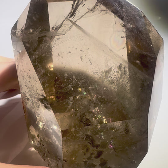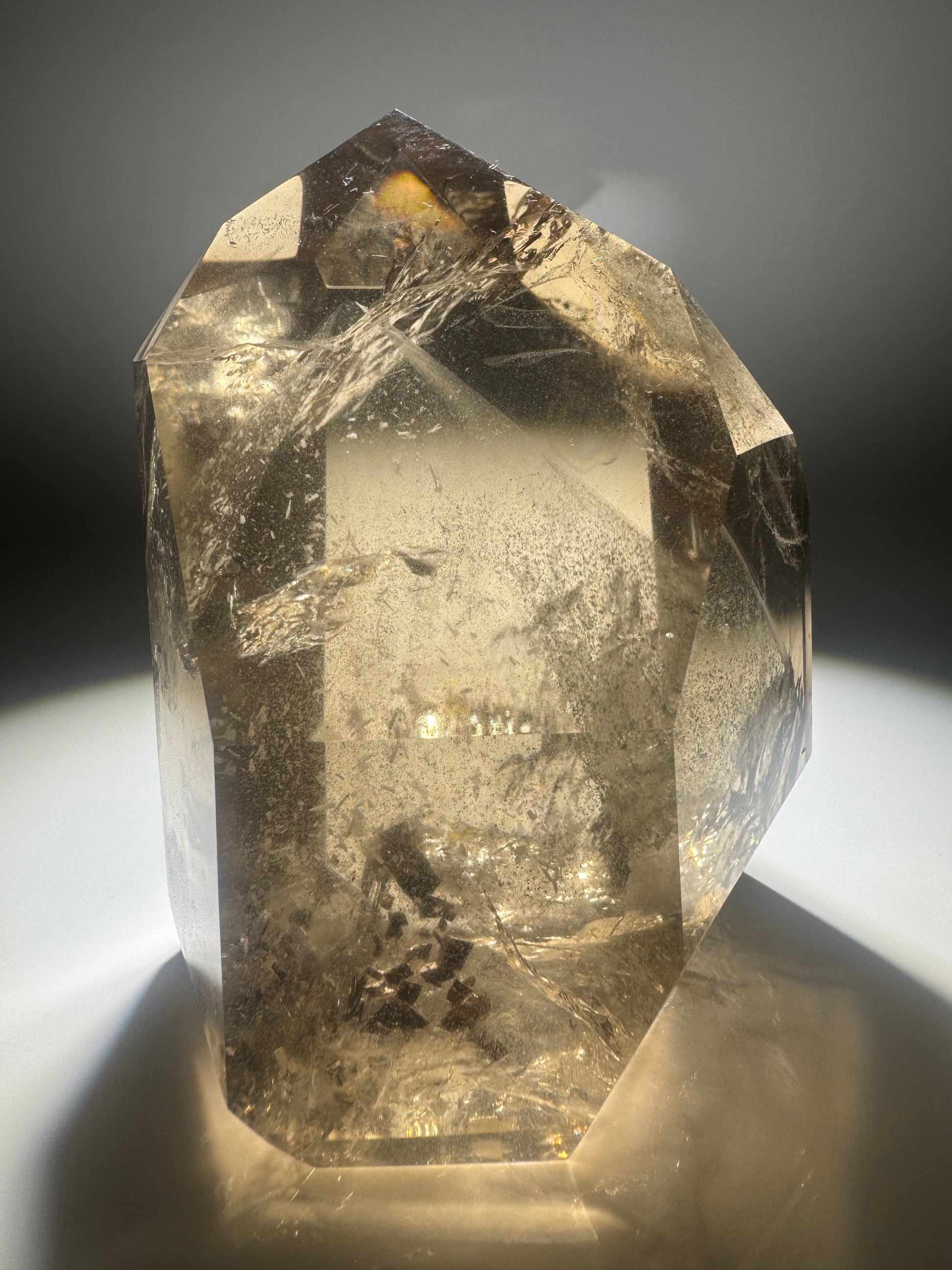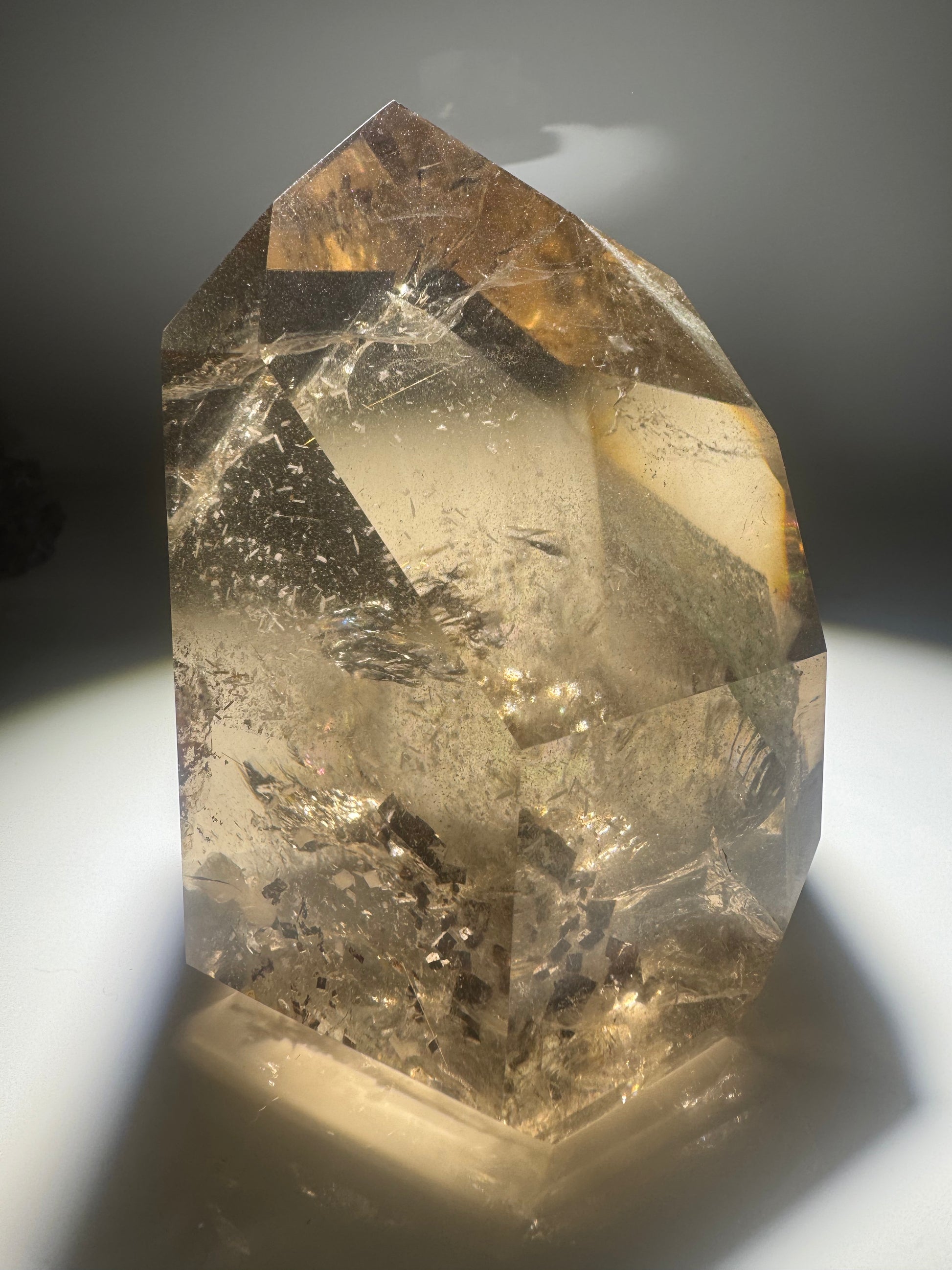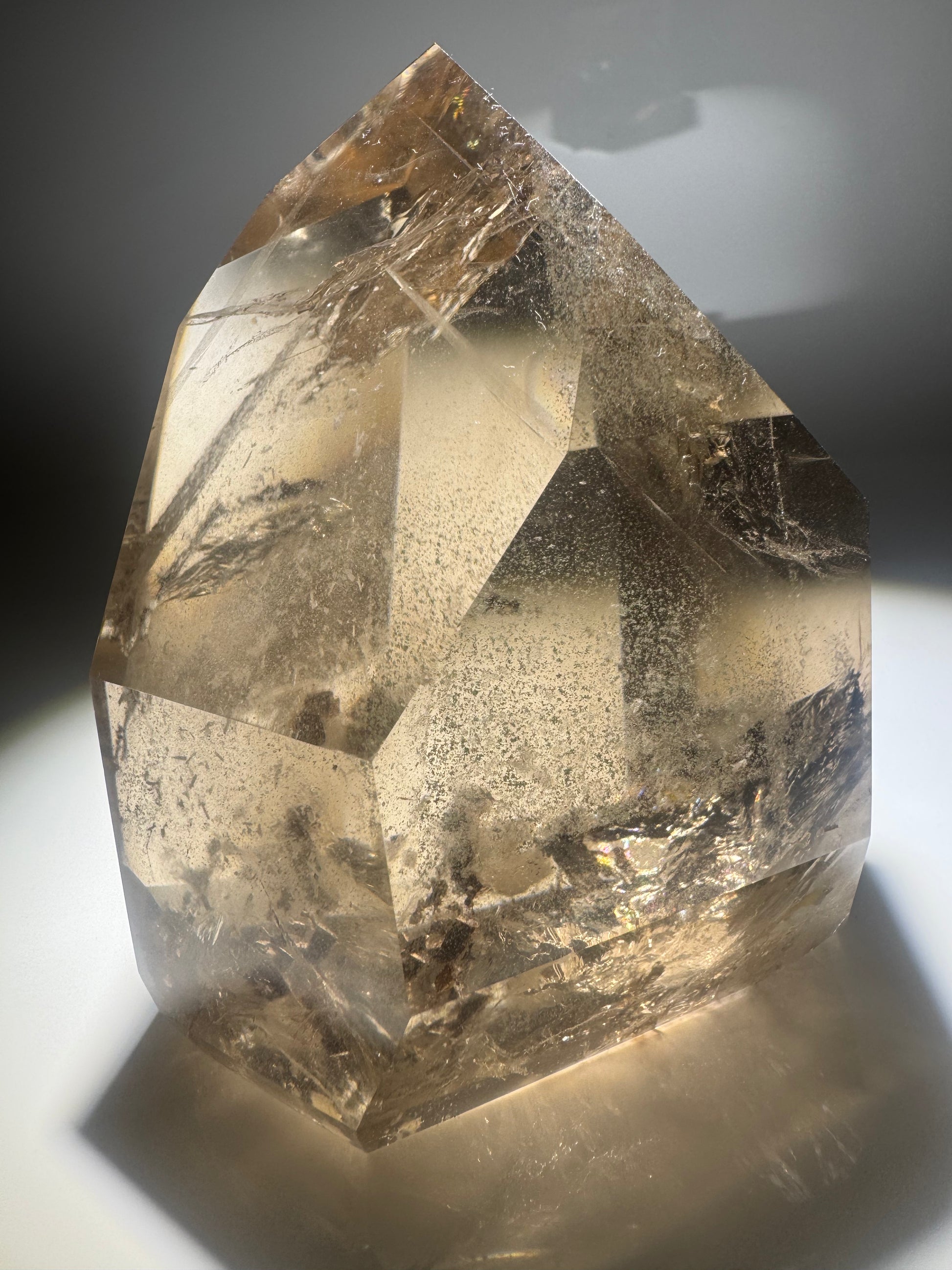 Diese extraklare Rauchquarz-Spitze aus Brasilien ist ein wahres Meisterwerk der Natur. Mit einer Höhe von 10 cm, einer Breite von 7,5 cm und einem Gewicht von 754 g vereint sie alles, was Sammlerinnen und Liebhaber edler Naturkunstwerke begeistert: strahlende Transparenz, bezaubernde Phantome, ein lebendiges Innenleben und funkelnde Regenbögen. Ein Stück in Museumsqualität, geschaffen über Millionen von Jahren.
