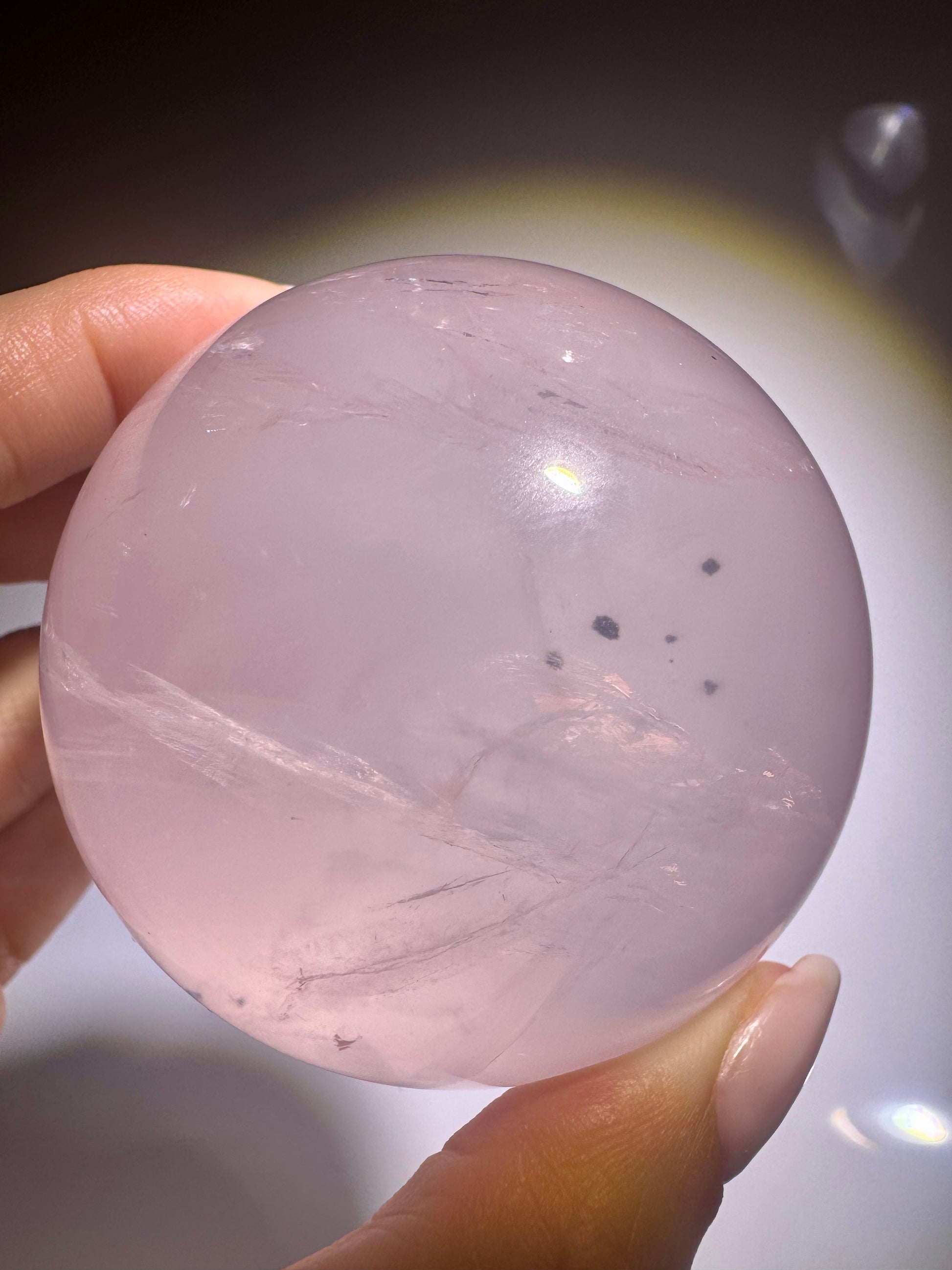 Diese bezaubernde Rosenquarzkugel verzaubert durch ihre zart-rosa Farbe und ihr magisches Inneres mit feinen Pyritkristallen. Je nach Lichteinfall zeigt sich das glitzernde Innenleben in immer neuen Facetten – ein echtes Naturkunstwerk, das zum Träumen einlädt ✨❄️